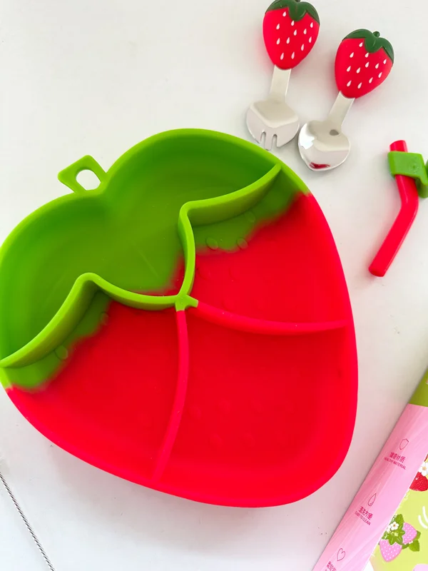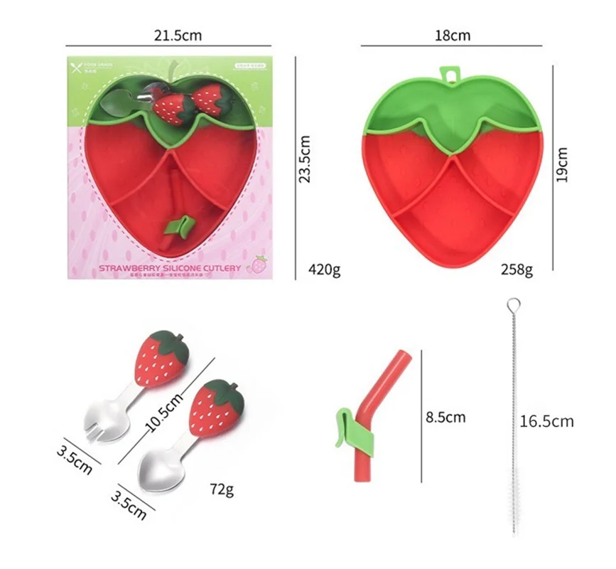 ست شامل بشقاب ۴ قسمتی که استاپر دارد و به میز میچسبد . تا کودک نتواند ظرف را برگرداند. قاشق و چنگال استیل با طراحی خاص مناسب دهان کودک. دارای نی سیلیکونی به همراه گیره مناسب برای اتصال به هر یک از ۴ قسمت از ظرف برای نوشیدن مایعات. دارای نی شور. طراحی بسیار جذاب و اشتها برانگیز مناسب کودکان